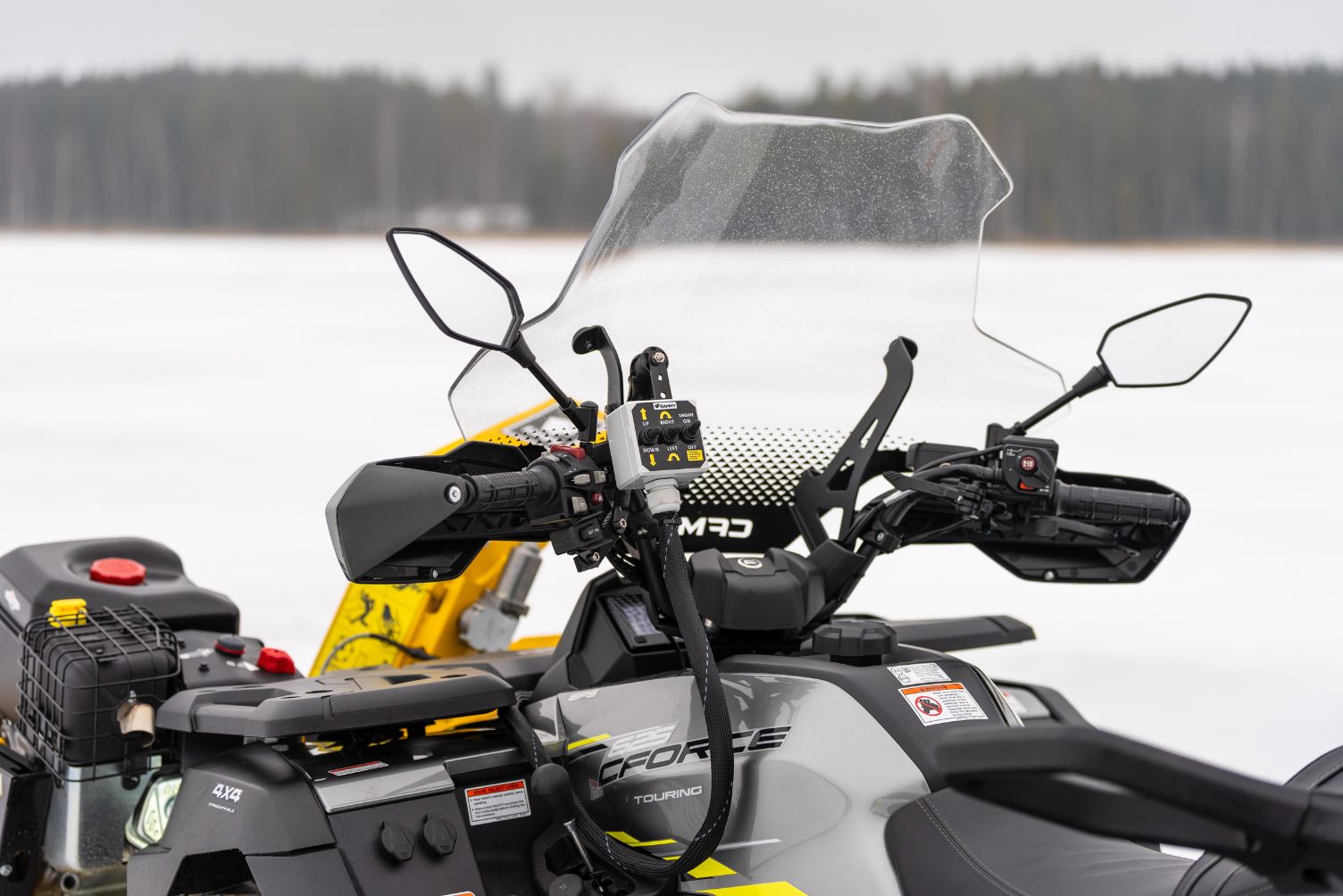 Die Schneefräse besitzt eine Fernsteuerung mit folgenden Optionen: Rotation und Winkel der Auswurfrinne, Kupplung, Motordrehzahl, Abschalten.
