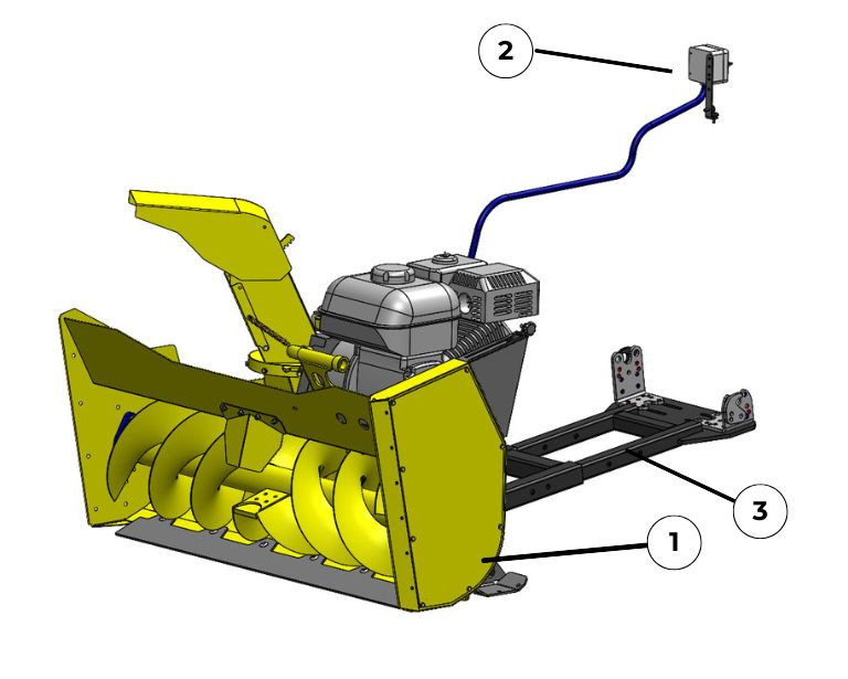 Die Rammy Schneefräse wird in einem einsatzbereiten Paket ausgeliefert. 1. Schneefräse, 2. Fernsteuerung, 3. einstellbarer Zubehörrahmen.