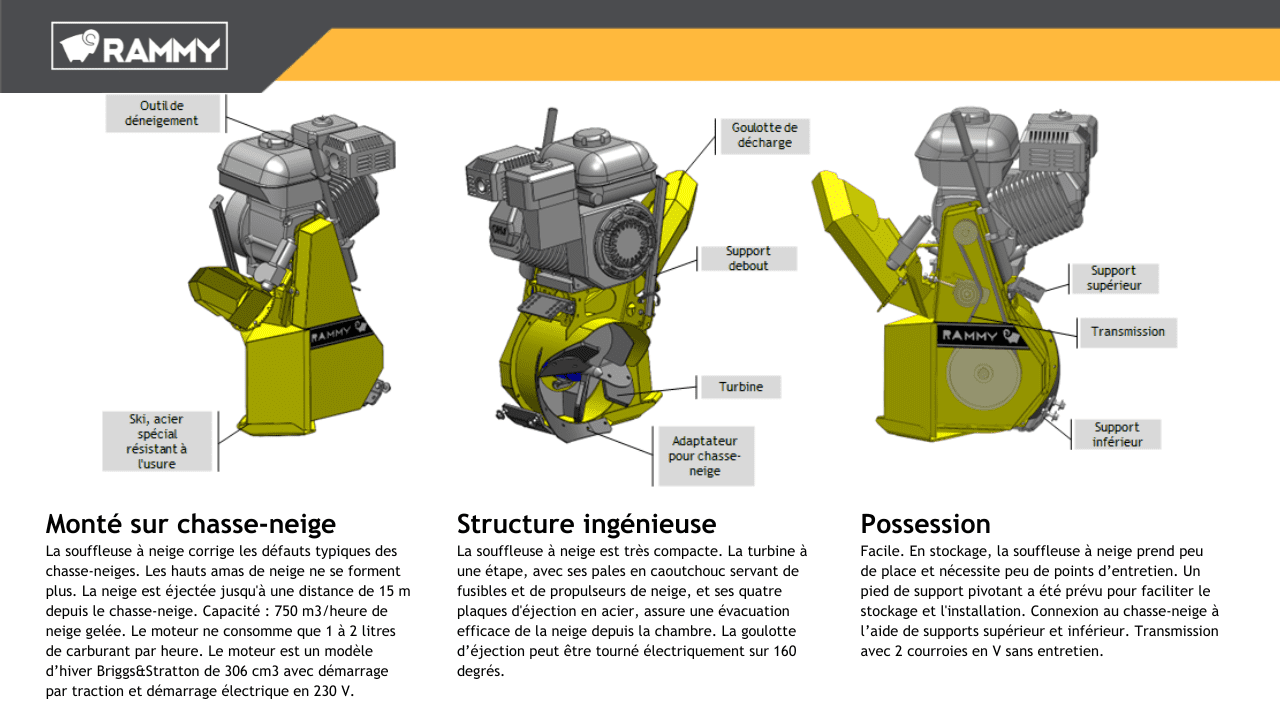Rammy Plow W165 ATV PRO est un produit marqué CE. Snow Thrower est breveté. |