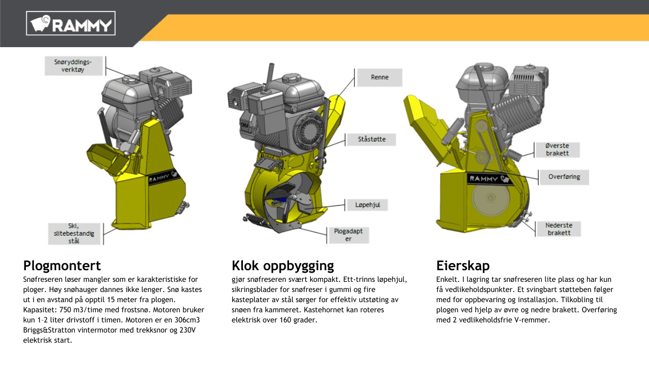 - Snøhauger dannes ikke lenger, da Rammy Thrower Plough kaster snøen over vollen.
