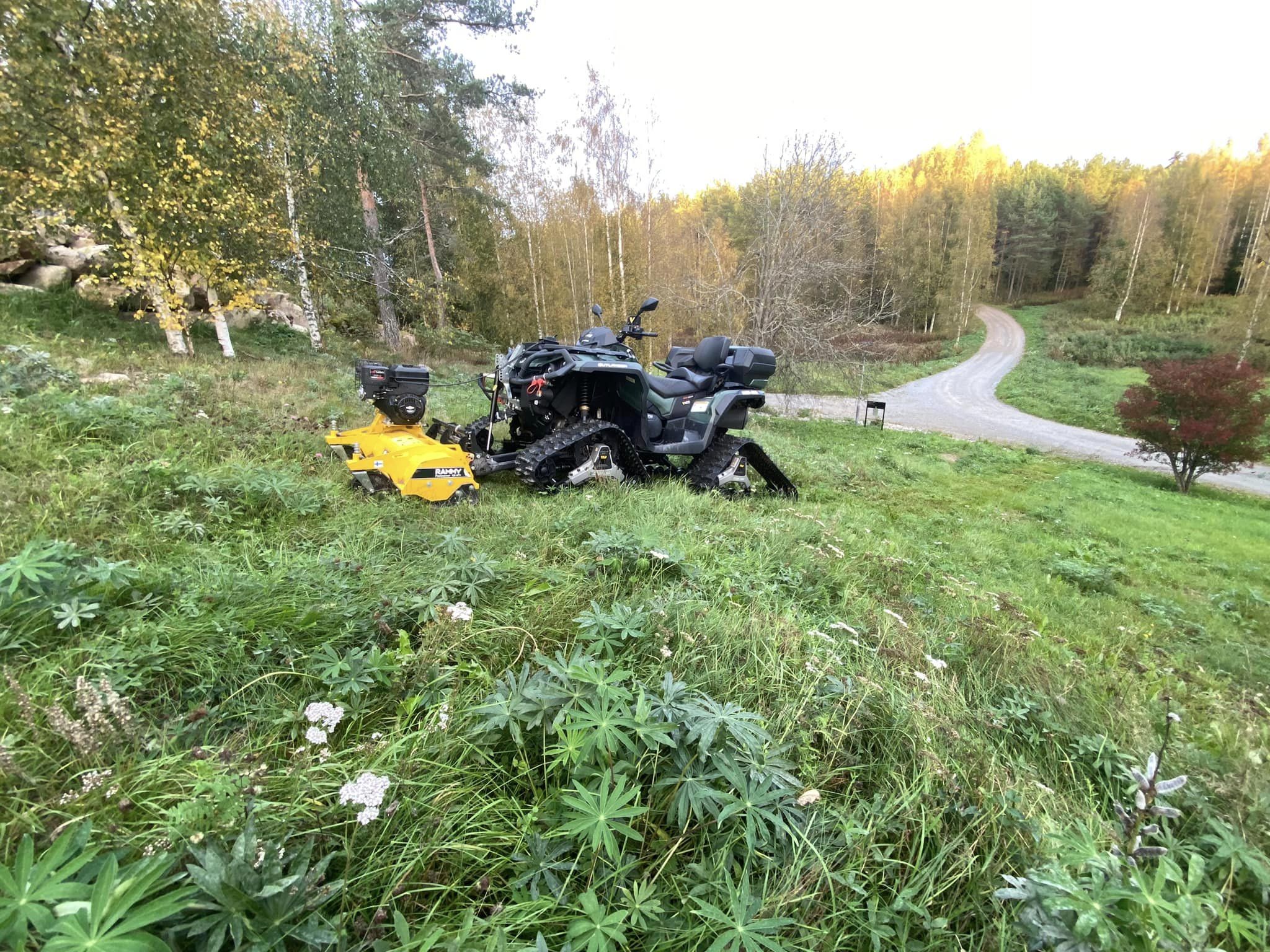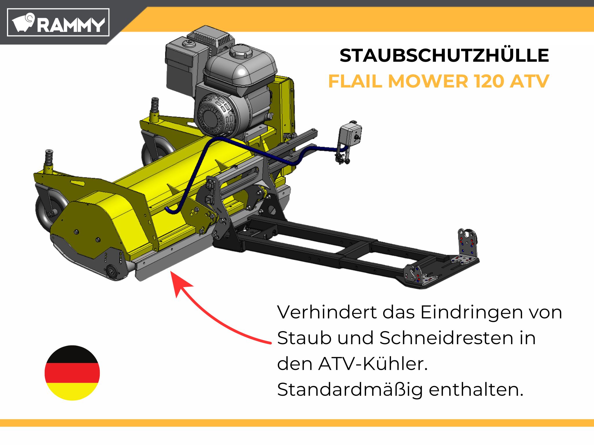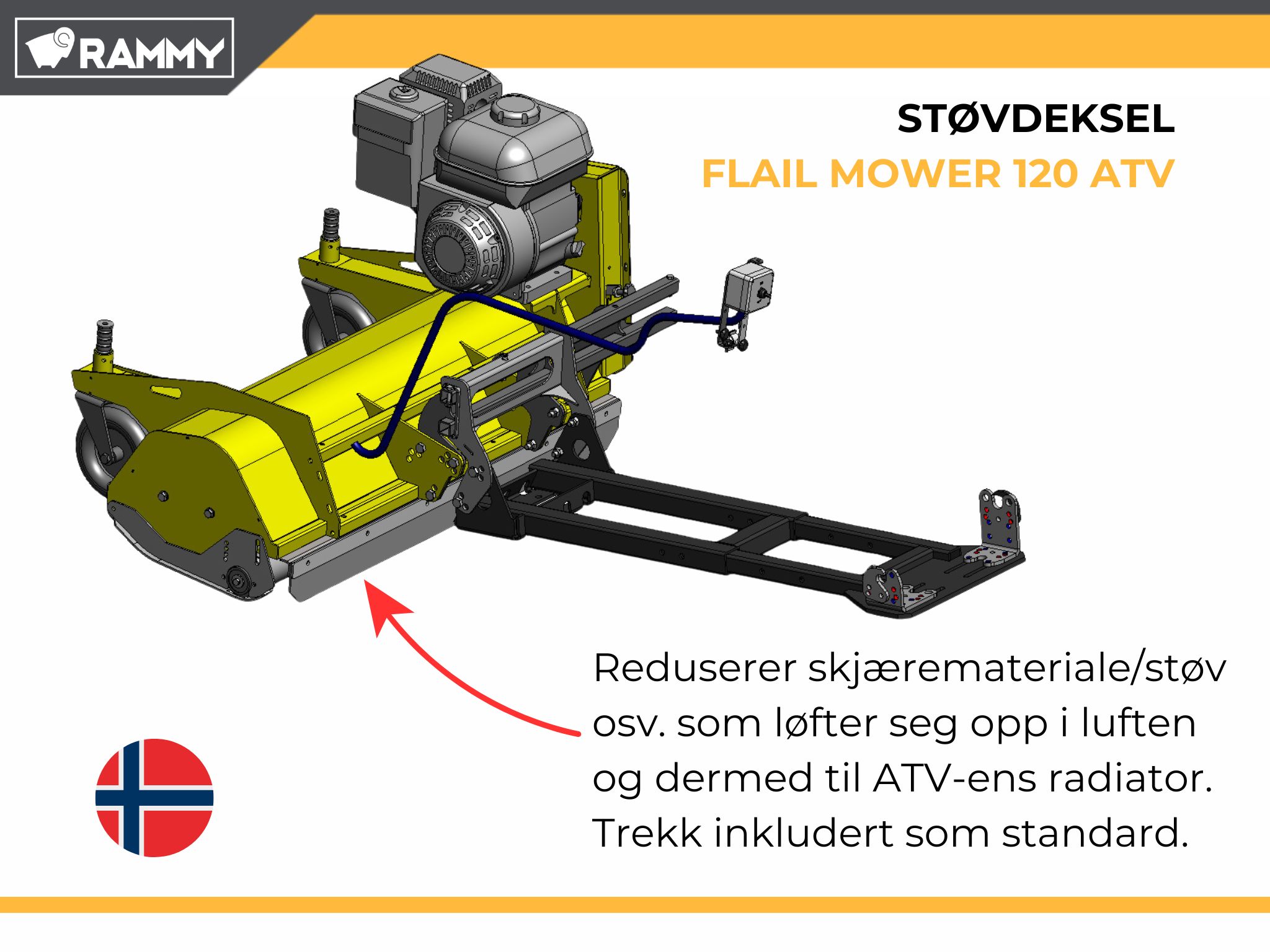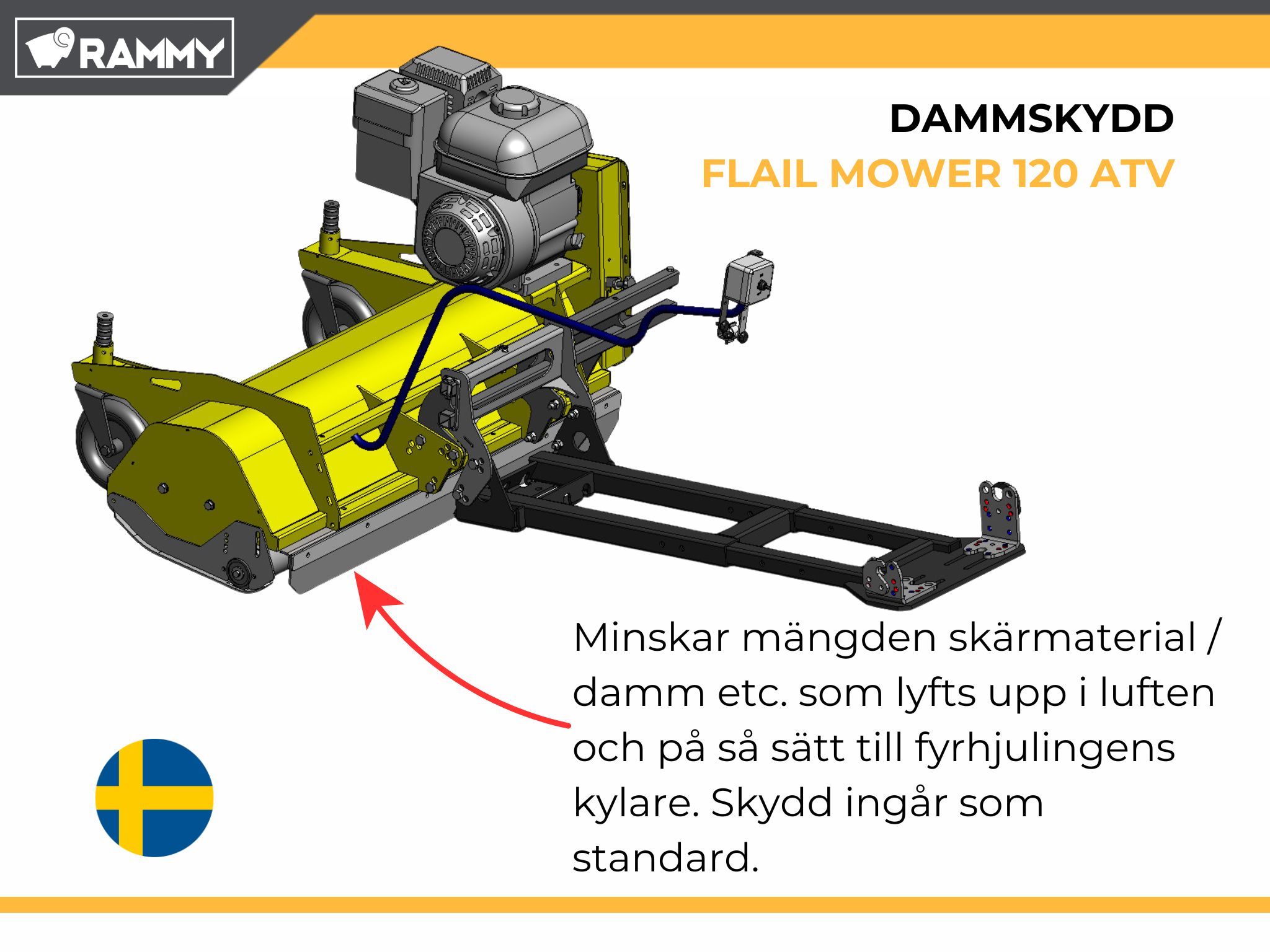 Rammy Flail mower 120 ATV on ketterä mönkijän niittyleikkuri heinän-, nurmen ja pienten puiden leikkaamiseen. Rammy etuleikkurilla saa ajettua tehokkaasti ja vaivattomasti nurmialueet, niityt ja tienvarret. Kun niittyleikkuri varustetaan vasaraterillä (lisävaruste), siitä tulee ruohonleikkuri, joka tekee hienoa leikkaustulosta. Niittyleikkurissa on oma moottori (306cm3).