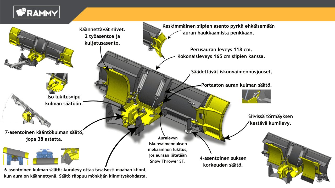 Auran kääntökulmaa voi säätää 7 eri asentoon -38 + 38 asteen välillä. Auran iskunvaimennuksen taittuva nivel voidaan lukita mekaanisesti sokkatapilla Auralumilinkoa (Snow Thrower ST) varten.